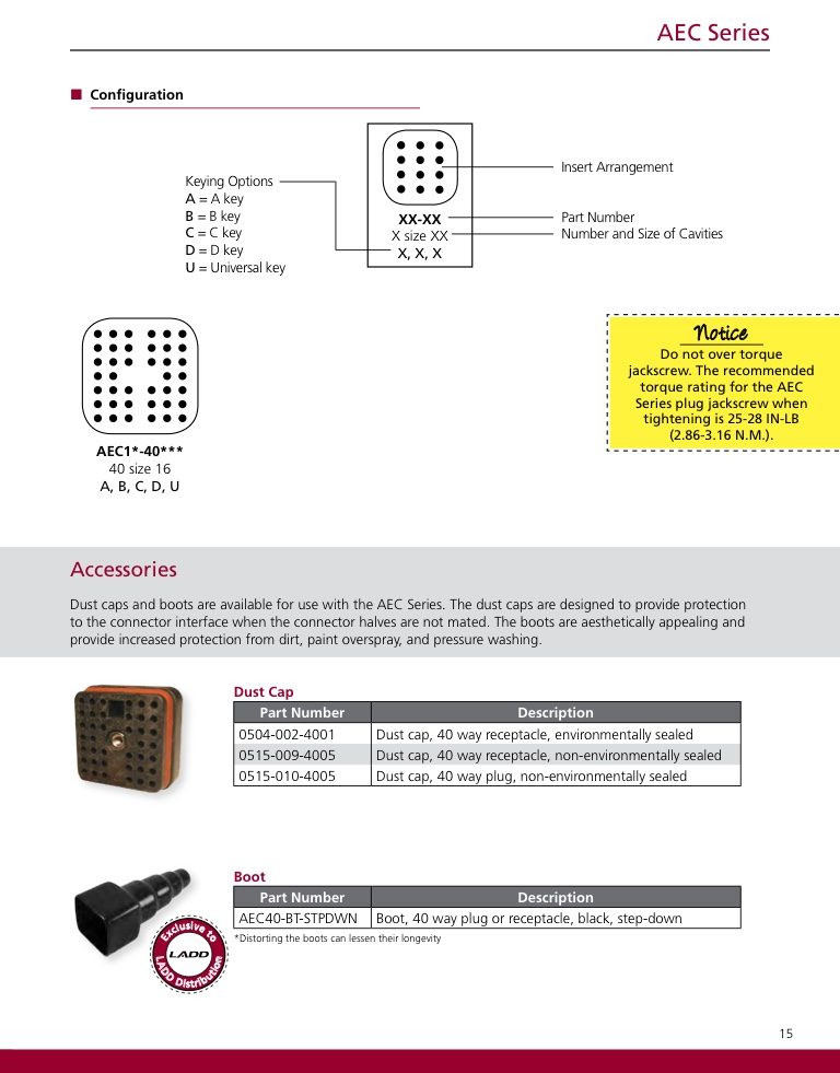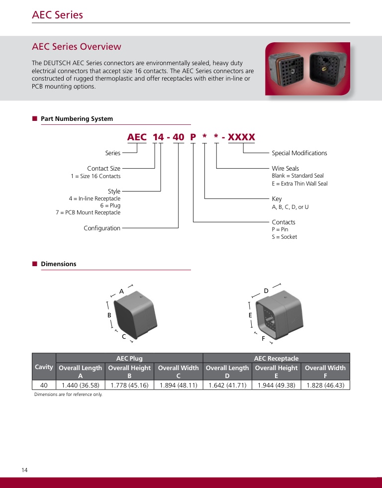 AEC-Serie Project Details: Grommet: Silicone rubber Jackscrew: Steel Plug Threaded Inserts: Steel Shell: Thermoplastic • Accepts contact size 16 (13 amps)• 14-20 AWG• 40 cavity arrangement• In-line or PCB mount• Square, thermoplastic housing• Jackscrew for mating
